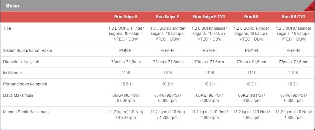 Seluruh varian New Honda Brio didukung oleh mesin i-VTEC 1.2 liter dengan tenaga maksimal 90 dk pada 6.000 rpm dan torsi 110 Nm pada 4.800 rpm.